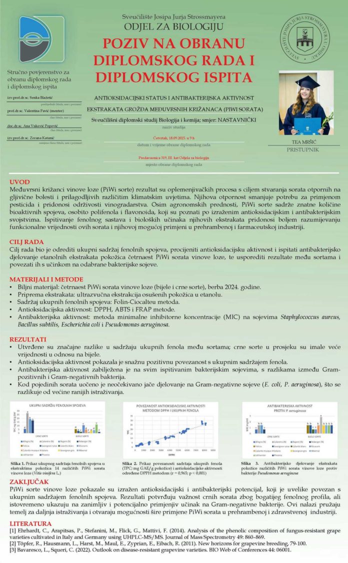 Naslov teme diplomskog rada: „Antioksidacijski status i antibakterijska aktivnost ekstrakata grožđa međuvrsnih križanaca (PiWi sorata)“.