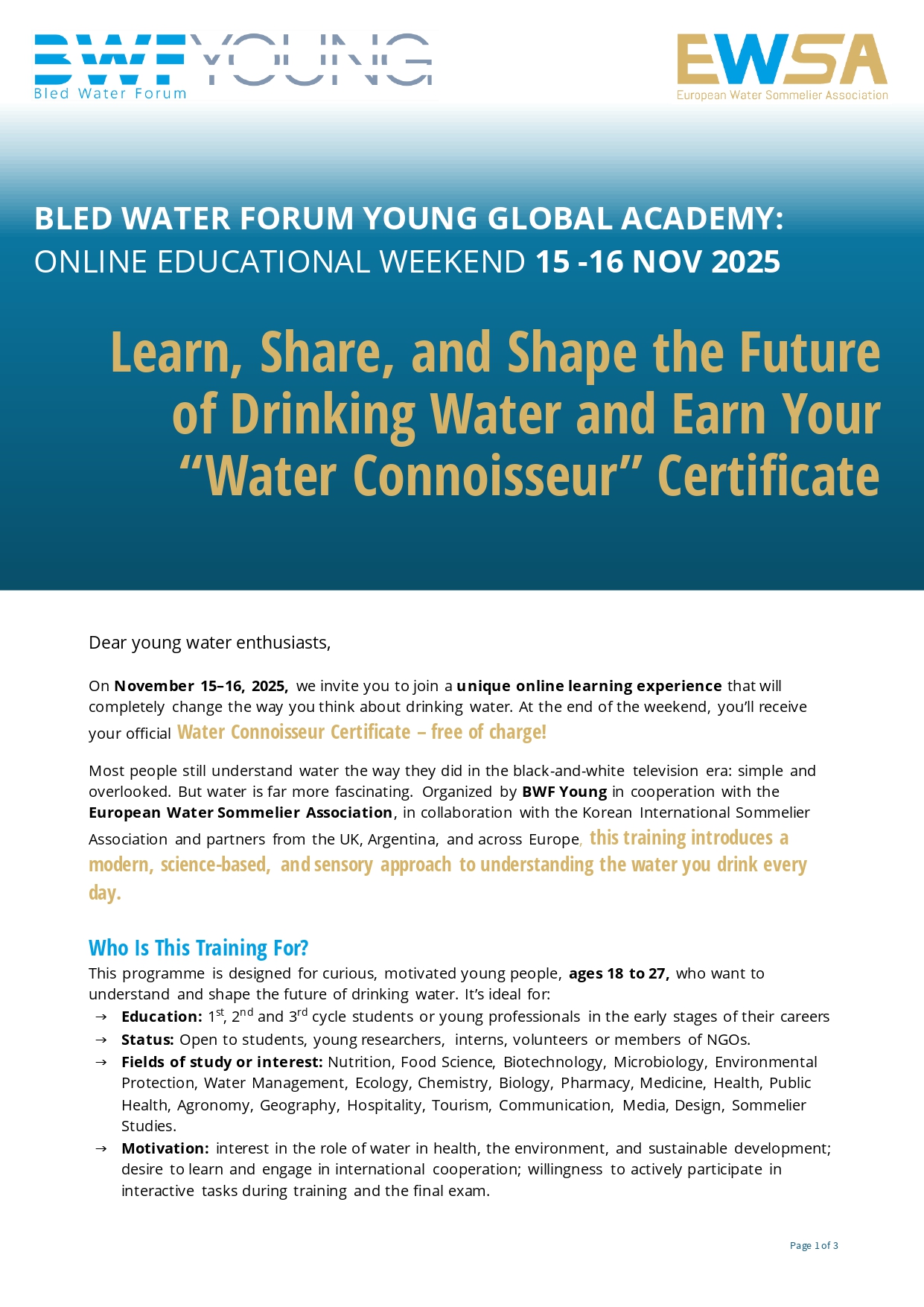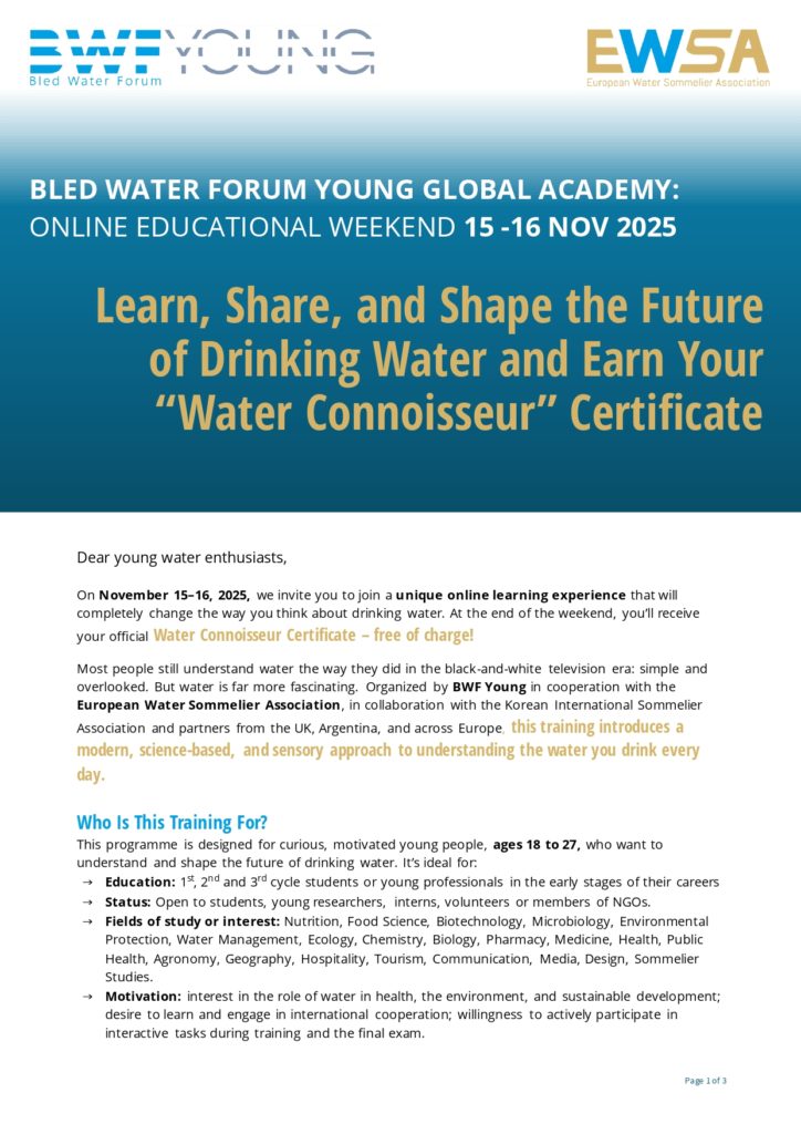 Ministarstvo zaštite okoliša i zelene tranzicije je zaprimilo informaciju o međunarodnoj obrazovnoj inicijativi Bled Water Foruma, usmjerenoj na povećanje svijesti o važnosti vode za ljudsku potrošnju i održivom upravljanju vodnim resursima.