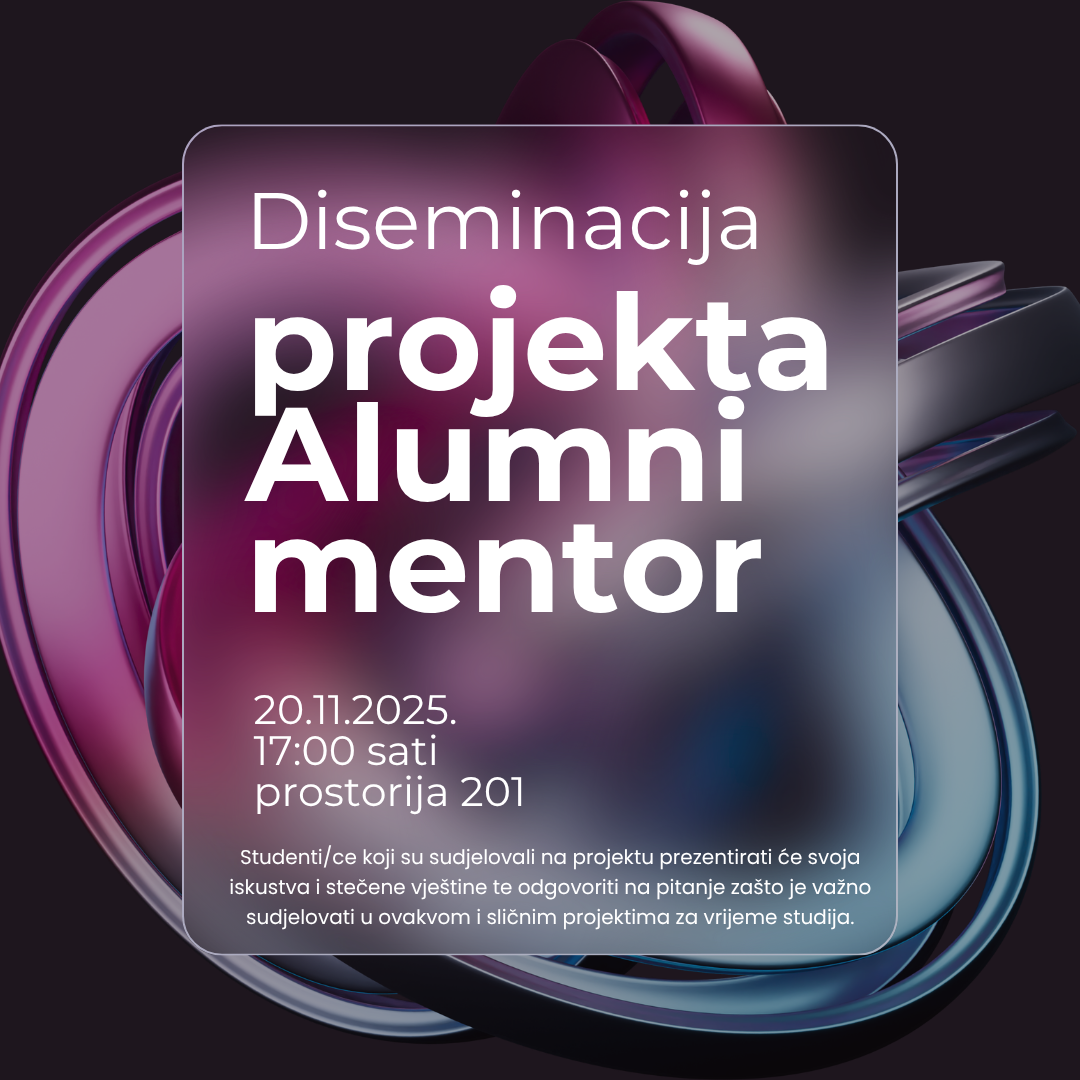 Pozivamo vas na predstavljanje rezultata i iskustava s projekta Alumni mentor 2025., koje će se održati 20. 11. u 17:00 sati u prostoriji 201.