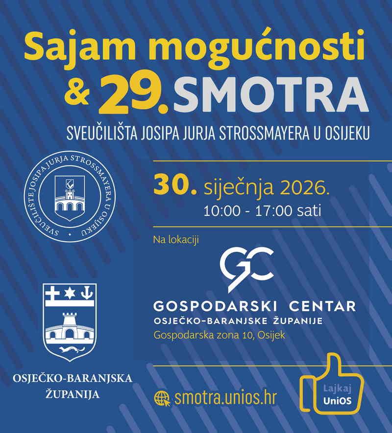 Sveučilište Josipa Jurja Strossmayera u Osijeku u suradnji s Osječko-baranjskom županijom organizira 29. Smotru Sveučilišta, namijenjenu svim učenicima srednjih škola, a posebno maturantima koji su u potrazi za informacijama o nastavku svoga obrazovanja.