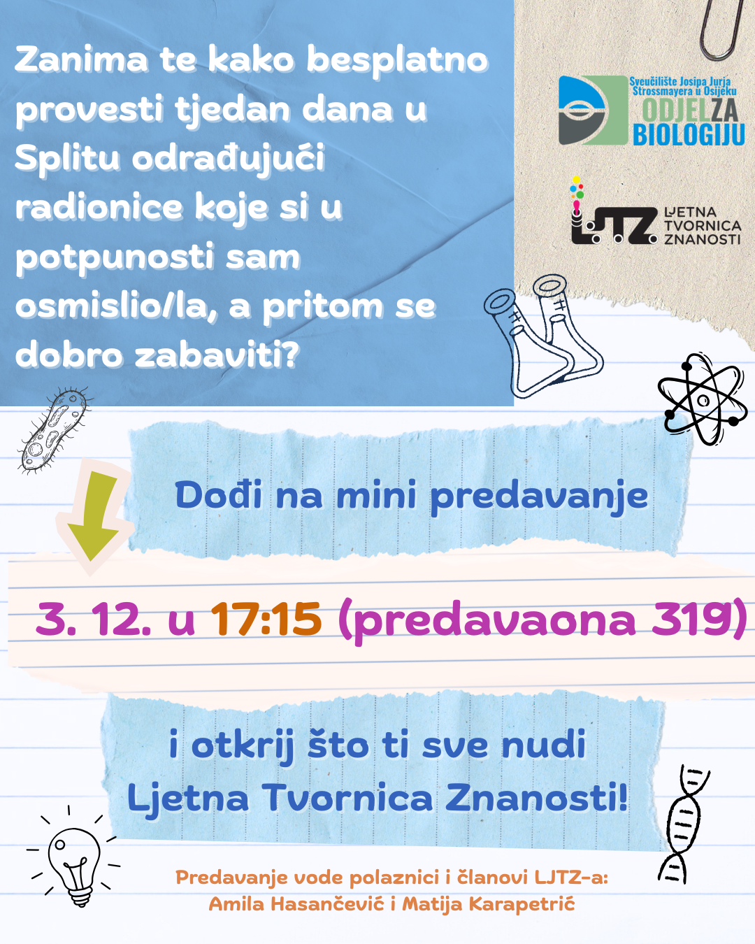 Ako vam ovo zvuči zanimljivo, dođite 3.12. u predavaonu 319 gdje će od 17:15 h studenti Odjela i članovi LJTZ-a, Amila Hasančević i Matija Karapetrić, s vama podijeliti svoja iskustva i uvjeriti vas zašto da se prijavite!