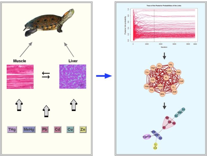 Znanstveni članak pod naslovom „Methylmercury, cadmium and plastron length topologically modulate multimetallic bioaccumulation in Colombian Slider (Trachemys callirostris): A Bayesian structure learning“ pionirsko je istraživanje koje prvi put primjenjuje Bayesove grafičke modele i mrežnu analizu kako bi se razotkrila struktura i složeni odnosi između više metala i morfometrijskih značajki kod slatkovodne kornjače Trachemys callirostris. Rezultati su pokazali da su metil-živa (MeHg) i kadmij (Cd) ključni čvorovi u mreži bioakumulacije te da morfometrijski parametri, osobito duljina plastrona, značajno moduliraju obrasce akumulacije. Osim toga, koncentracije ukupne žive (THg) izmjerene u mišićima i jetri nalazile su se unutar hematotoksičnih vrijednosti, što ukazuje na potencijalne rizike za zdravlje ovih organizama, ali i na moguće implikacije za ljudske populacije koje ovise o njima kao izvoru hrane.