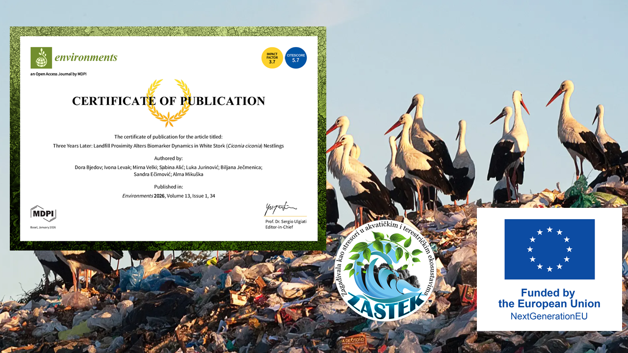 S ponosom dijelimo vijest o znanstvenim rezultatima ostvarenima u okviru projekta Zagađivala kao stresori u akvatičkim i terestričkim ekosustavima (ZASTEK), financiranog od Europske unije kroz program NextGenerationEU. Rezultati istraživanja objavljeni su u znanstvenom časopisu Environments ( Q1, IF 3,7) u radu: