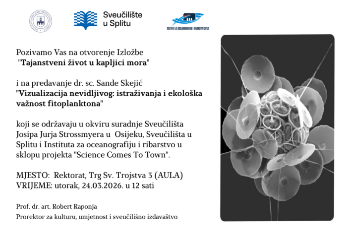 Pozivamo Vas na otvorenje Izložbe “Tajanstveni život u kapljici mora” i na predavanje dr. sc. Sande Skejić “Vizualizacija nevidljivog: istraživanja i ekološka važnost fitoplanktona” koji se održavaju u okviru suradnje Sveučilišta Josipa Jurja Strossmayera u Osijeku, Sveučilišta u Splitu i Instituta za oceanografiju i ribarstvo u sklopu projekta “Science Comes To Town”.