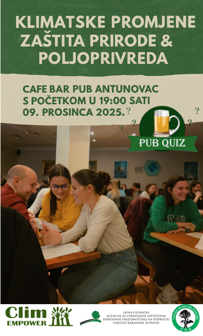 U sklopu projekta ClimEmpower, Javna ustanova za zaštitu prirode Osječko-baranjske županije i studenti Udruge biologije ZOA organiziraju PUB kviz o klimatskim promjenama, zaštićenim područjima i poljoprivredi.