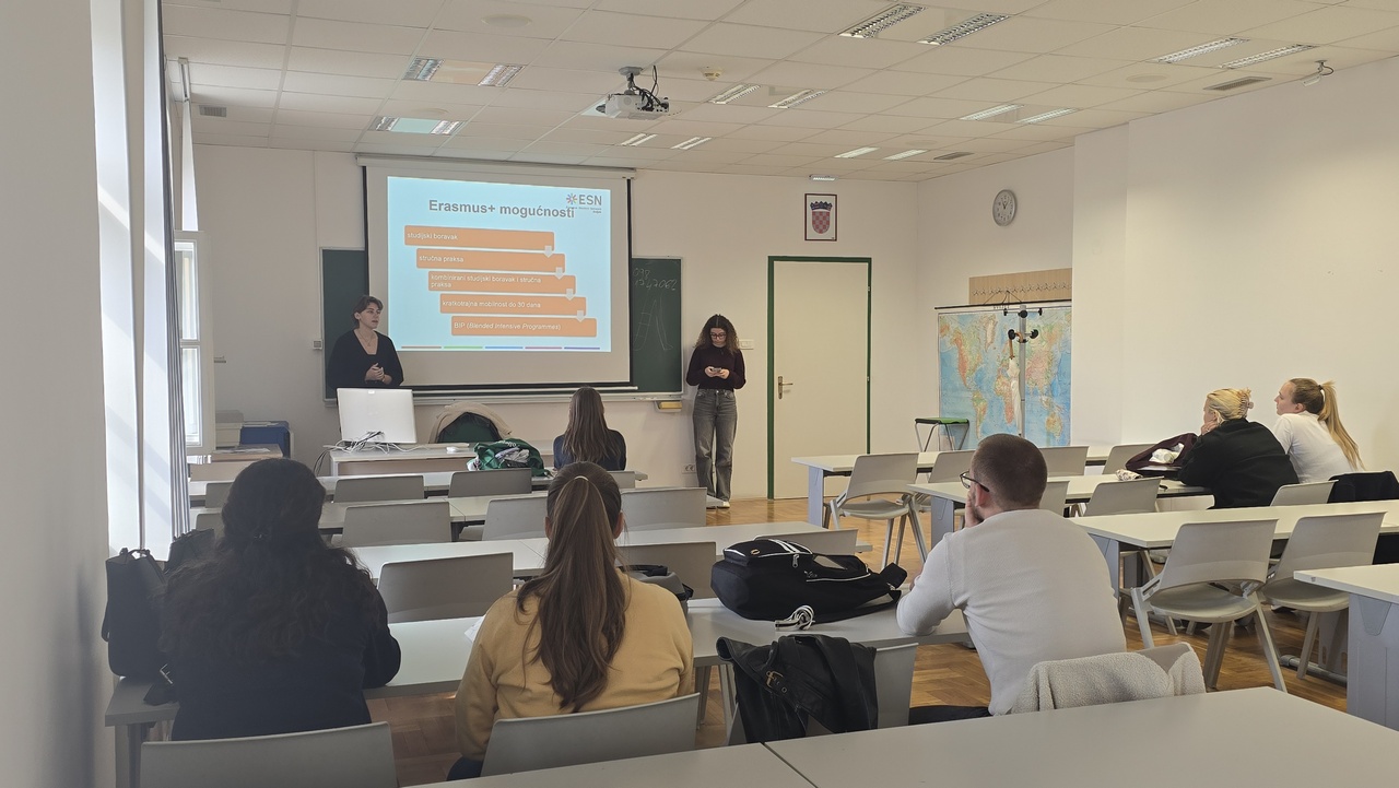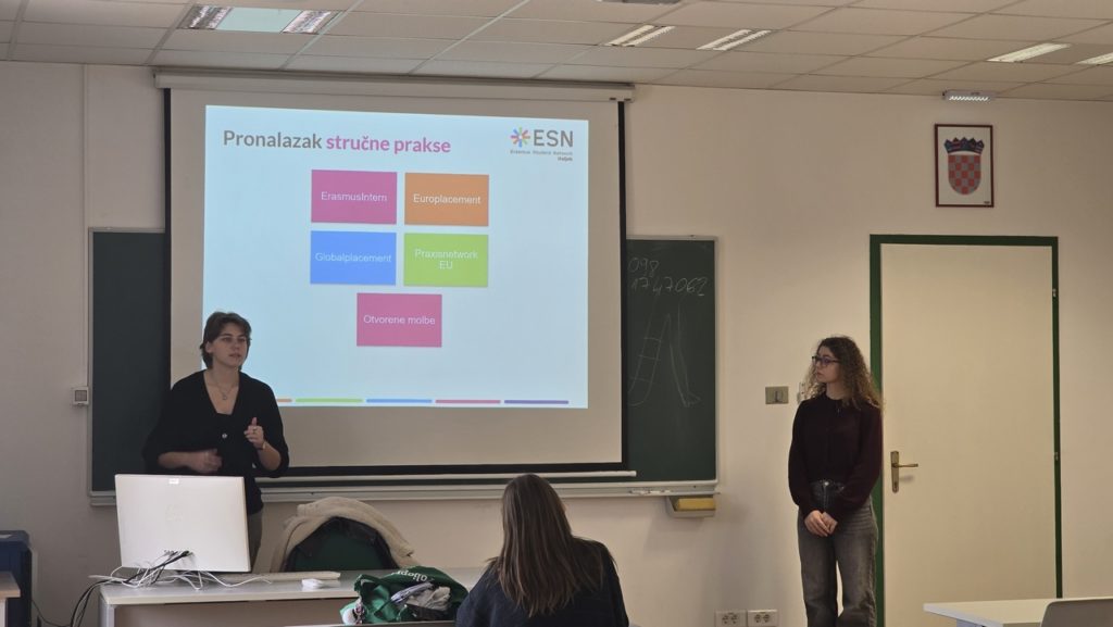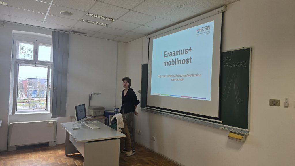 Jučer, 17. ožujka 2026. godine održano je informativno predstavljanje Erasmus Student Network Osijek i Erasmus+ programa koje su vodili predstavnici te studentske organizacije. Studenti su imali priliku saznati sve o programu Erasmus+ mogućnostima mobilnosti te različitim oblicima uključivanja u međunarodna iskustva.