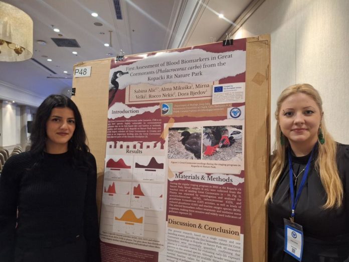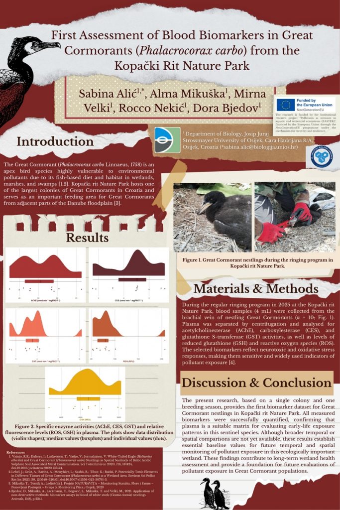 Studentica druge godine Sveučilišnog diplomskog studija Zaštita prirode i okoliša, Sabina Alić, predstavila je svoj prvoautorski istraživački rad na 15. Hrvatskom biološkom kongresu, održanom u Zagrebu od 20. do 23. studenoga 2025. godine. Predstavljeni poster, pod nazivom First Assessment of Blood Biomarkers in Great Cormorants (Phalacrocorax carbo) from the Kopački Rit Nature Park, donosi prvi sustavni uvid u aktivnosti enzimskih i neenzimskih biomarkera u krvi ptića kormorana u Hrvatskoj te daje temelj za buduća istraživanja izloženosti ptica okolišnim zagađivalima.
