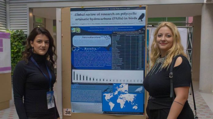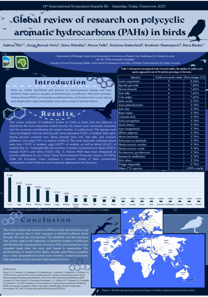 Studentica 1. godine sveučilišnog diplomskog studija Zaštita prirode i okoliša, Sabina Alić, u suradnji s doc. dr. sc. Dorom Bjedov, Jorgeom Bernal-Alvizom, doc. dr. sc. Almom Mikuškom, izv. prof. dr. sc. Mirnom Velki te kolegama s Prehrambeno-tehnološkom fakulteta Osijek izv. prof. dr. sc. Kristinom Habschied i prof. dr. sc. Krešimirom Mastanjevićem, predstavila je na 14. međunarodnom simpoziju Kopački rit – Jučer, Danas, Sutra 2025 pregledni poster pod naslovom “Global review of research on polycyclic aromatic hydrocarbons (PAHs) in birds”. Rad je proizišao iz uspješno provedenih studentskih projekata koje je financirao Studentski zbor Sveučilišta u Osijeku – “Subletalni učinci policikličkih aromatskih ugljikovodika (PAH) na kormorane (Phalacrocorax carbo)” i “Interdisciplinarni pristup očuvanju ekološke ravnoteže močvarnih ekosustava” – provedenih pod mentorstvom doc. dr. sc. Dore Bjedov. Poster sintetizira nalaze 54 objavljena rada i pokazuje da su ptice izvrsni bioindikatori izloženosti PAH-ovima, pri čemu se najčešće istražuju vodene i obalne vrste te grabljivice; najzastupljenija su tkiva jetra, krv i perje, a biomarkeri oksidativnog stresa i enzimske aktivnosti ostaju ključni alati za procjenu subletalnih učinaka. Analiza ističe potrebu za većom metodološkom ujednačenošću i bolju prostornu pokrivenost istraživanja, jer su “vruće točke” uglavnom u Europi i Sjevernoj Americi, dok su brojna područja još uvijek istraživački podcijenjena. Zaključno, rad donosi smjernice za standardizirani biomonitoring i očuvanje ptičjih populacija te potvrđuje važnost interdisciplinarnog pristupa u zaštiti močvarnih ekosustava.