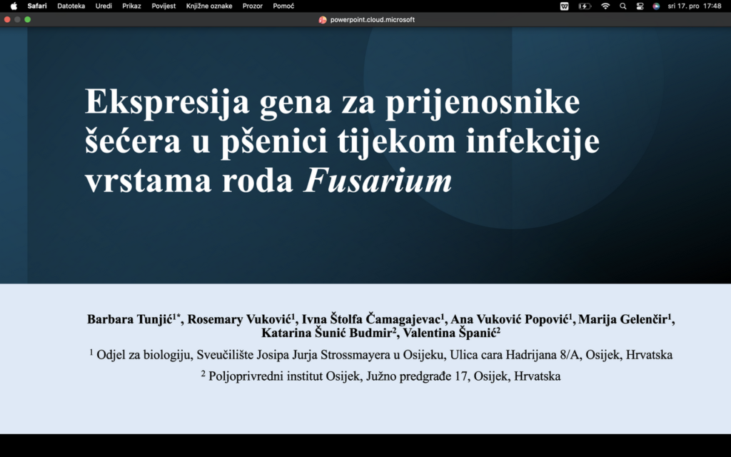 Studentica Barbara Tunjić izložila je rezultate studentskog projekta „Prijenosnici šećera kao posrednici komunikacije između biljke i patogena“ kroz kratko priopćenje „Ekspresija gena za prijenosnike šećera u pšenici tijekom infekcije vrstama roda Fusarium“.