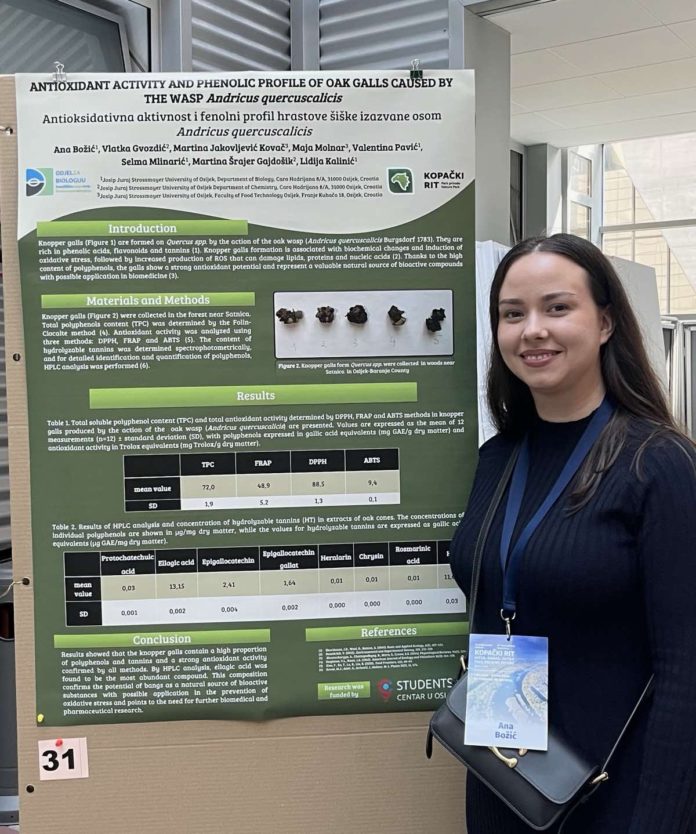 Ana Božić, studentica 2. godine diplomskog sveučilišnog studija Biologija; smjer znanstveni, uz mentorstvo izv. prof. dr. sc. Lidije Kalinić i izv. prof. dr. sc. Vlatke Gvozdić provela je istraživanje antioksidativnog potencijala i zaštitnog učinka ekstrakta šiški hrasta (Quercus spp.) . Hrastove šiške nastaju kao posljedica djelovanja ose šiškarice (Andricus quercuscalicis Burgsdorf). Ekstrakt šiški pokazao je značajni antioksidativni potencijal koji se može pripisati visokom sadržaju bioaktivnih tvari kao što su polifenoli, flavonoidi i tanini.  Dobiveni rezultati potvrđuju da hrastove šiške mogu biti vrijedan prirodni izvor antioksidansa te ukazuju na potrebu za daljnjim istraživanjima njihove biološke relevantnosti i mogućih primjena.