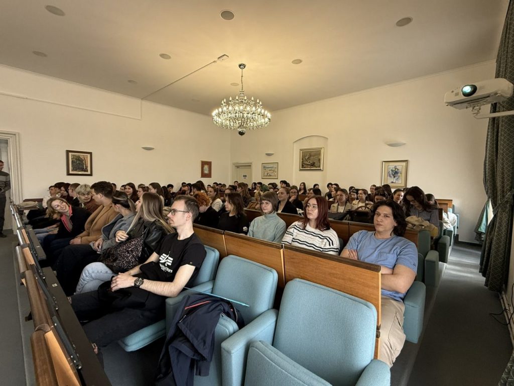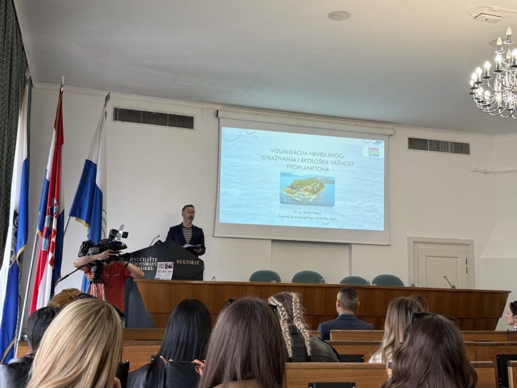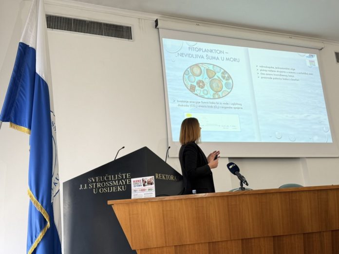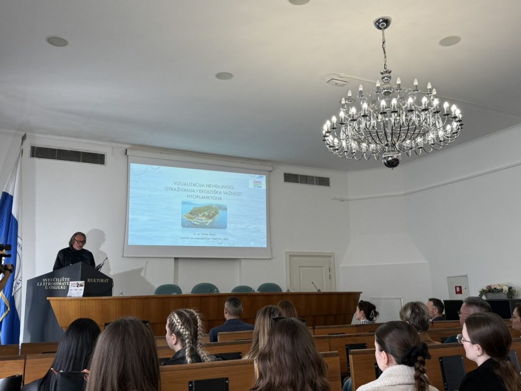 U utorak, 24. ožujka 2026. godine, u Auli Rektorata na Sveučilištu Josipa Jurja Strossmayera u Osijeku, studenti sveučilišnog prijediplomskog studija Biologija i sveučilišnog diplomskog studija Biologija; smjer: znanstveni, uz vodstvo izv. prof. dr. sc. Filipa Stevića, posjetili su izložbu „Tajanstveni život u kapljici mora“ te sudjelovali na predavanju dr. sc. Sande Skejić pod nazivom „Vizualizacija nevidljivog: istraživanja i ekološka važnost fitoplanktona“. Događanje je organizirano u sklopu projekta Science Comes To Town, u suradnji sa Sveučilištem u Splitu i Institutom za oceanografiju i ribarstvo. Studenti su imali priliku saznati o važnosti fitoplanktona za morske ekosustave i globalne biogeokemijske procese, kao i o suvremenim istraživanjima ovih mikroskopskih organizama.