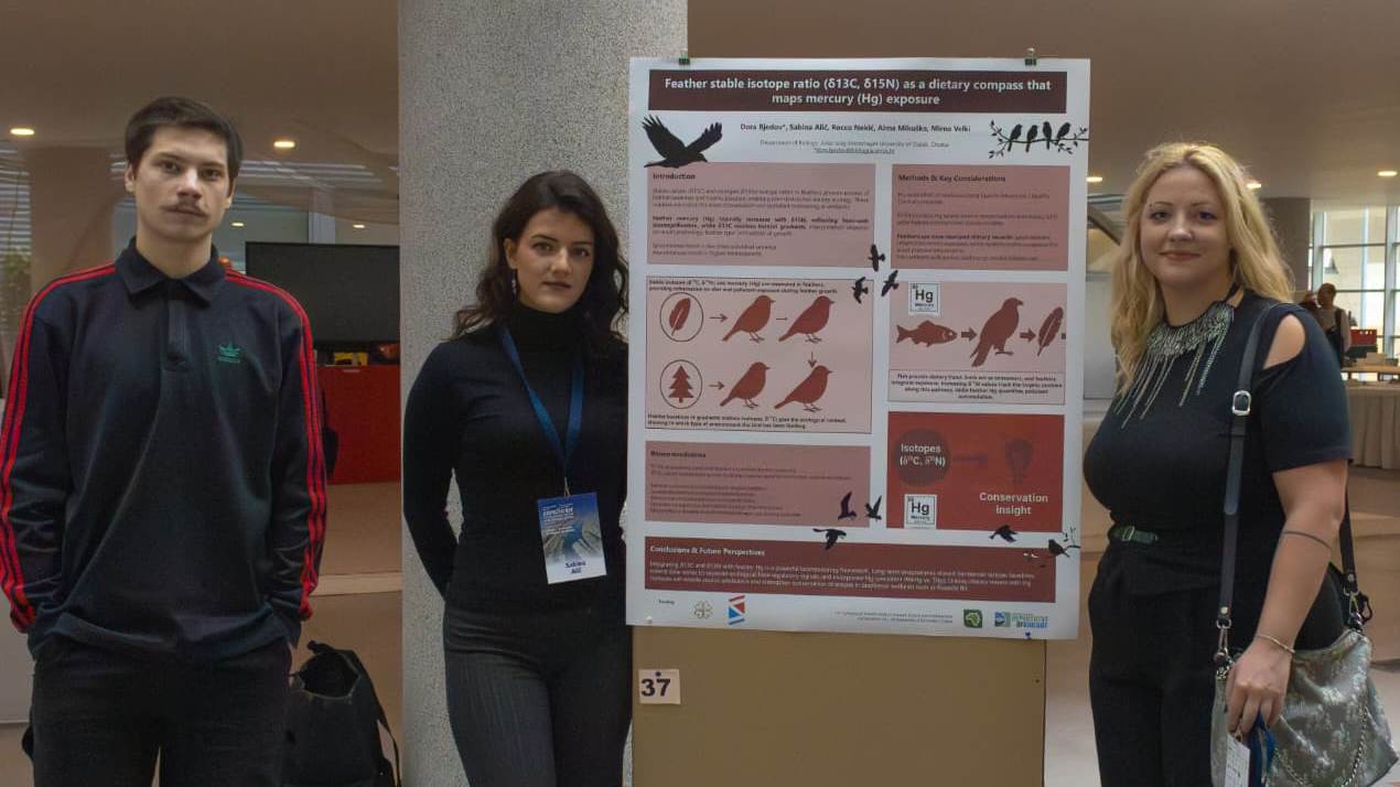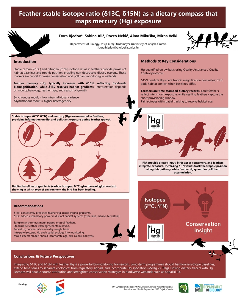 Studentica 1. godine sveučilišnog diplomskog studija Zaštita prirode i okoliša Sabina Alić i student 3. godine sveučilišnog prijediplomskog studija Biologije Rocco Nekić vrlo su uspješno proveli dva studentska projekta – “Od izvora do reakcije: geoprostorno izotopsko mapiranje i biokemijska procjena stresa kod bijelih roda (Ciconia ciconia)” te “Elementarna analiza δ¹³C i δ¹⁵N u perju za razumijevanje prostorno-trofičke dinamike migratornih vrsta na afričko-euroazijskom migratornom putu” – te su, pod mentorstvom doc. dr. sc. Dore Bjedov i u suradnji s doc. dr. sc. Almom Mikuškom i izv. prof. dr. sc. Mirnom Velki, predstavili istraživački poster “Feather stable isotope ratio (δ¹³C, δ¹⁵N) as a dietary compass that maps mercury (Hg) exposure” na 14. međunarodnom simpoziju Kopački rit – Jučer, Danas, Sutra 2025. Poster donosi jasan okvir kako stabilni izotopi u perju bilježe ishranu i stanišne gradijente: živa (Hg) u perju raste s višim δ¹⁵N (trofička magnifikacija), dok δ¹³C diferencira tip staništa, čime perje postaje vremenski obilježen “dnevnik” ishrane i izloženosti. Naglašene su dobre laboratorijske prakse (QA/QC), potreba harmonizacije izotopnih baznih linija i uključivanje kovariata (dob, spol, kolonija, godina) u mješovite modele, uz perspektivu uvođenja specijacije žive (MeHg vs.THg) i prostorne ekologije u dugoročni monitoring. Poster je osvojio prvo mjesto za najbolji poster simpozija, čime je potvrđena izvrsnost naših studenata i tima Odjela za biologiju.
