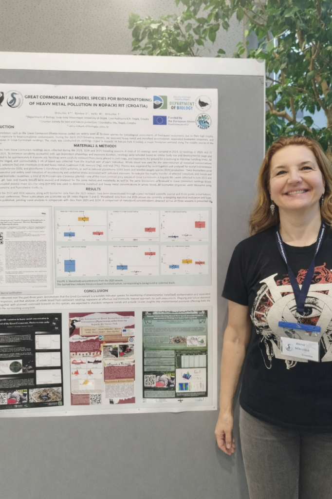 Prvo priopćenje pod nazivom „Veliki vranac kao modelna vrsta za biomonitoring onečišćenja teškim metalima u Kopačkom ritu (Hrvatska)” autora doc.dr.sc.Alma Mikuška, doc.dr.sc Dora Bjedov, prof.dr.sc.Mirna Velki s Odjela za biologiju i Tibora Mikuške B.Sc. iz Hrvatskog društva za zaštitu ptica i prirode predstavilo je rezultate trogodišnjeg istraživanja akumulacije teških metala i metaloida, te biomarkera fiziološkog odgovora ptića velikog vranca (Phalacrocorax carbo) u Parku prirode Kopački rit. Ovo konferencijsko priopćenje izrađeno je u okviru projekta: Zagađivala kao stresori u akvatičkim i terestričkim ekosustavima (ZASTEK), financiranog od Europske unije kroz program NextGenerationEU.