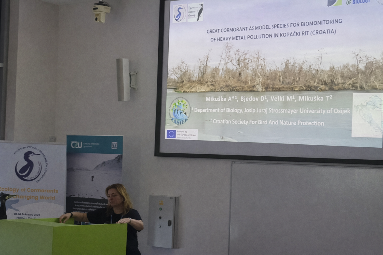 Prvo priopćenje pod nazivom „Veliki vranac kao modelna vrsta za biomonitoring onečišćenja teškim metalima u Kopačkom ritu (Hrvatska)” autora doc.dr.sc.Alma Mikuška, doc.dr.sc Dora Bjedov, prof.dr.sc.Mirna Velki s Odjela za biologiju i Tibora Mikuške B.Sc. iz Hrvatskog društva za zaštitu ptica i prirode predstavilo je rezultate trogodišnjeg istraživanja akumulacije teških metala i metaloida, te biomarkera fiziološkog odgovora ptića velikog vranca (Phalacrocorax carbo) u Parku prirode Kopački rit. Ovo konferencijsko priopćenje izrađeno je u okviru projekta: Zagađivala kao stresori u akvatičkim i terestričkim ekosustavima (ZASTEK), financiranog od Europske unije kroz program NextGenerationEU.