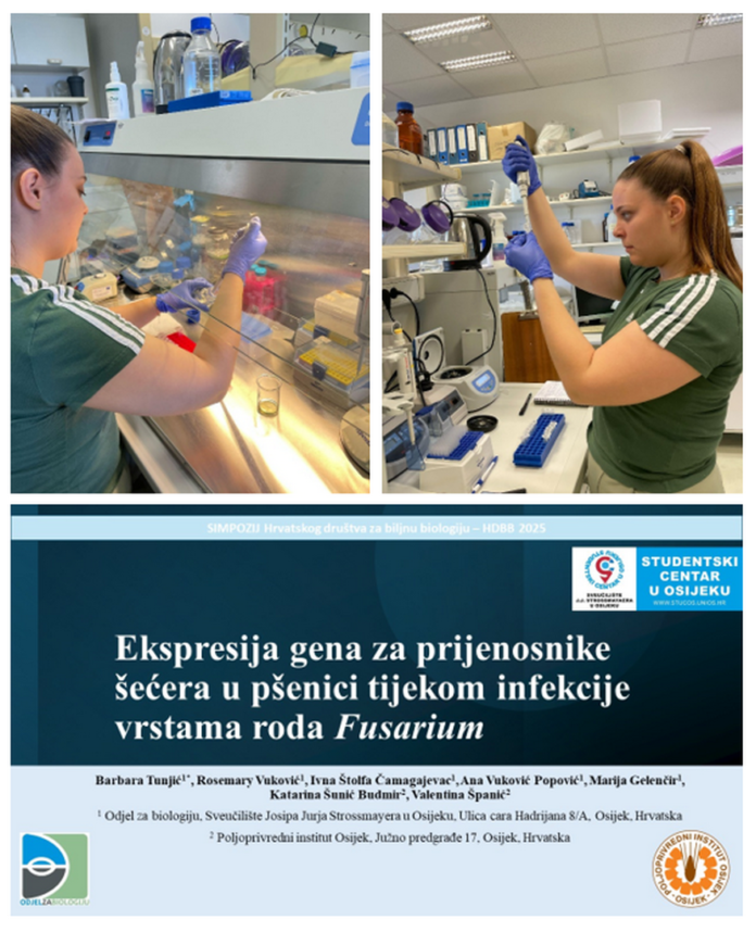 U razdoblju od lipnja do prosinca 2025. godine uspješno je proveden studentski projekt „Prijenosnici šećera kao posrednici komunikacije između biljke i patogena“ voditeljice Barbare Tunjić, studentice 1. godine Sveučilišnog diplomskog studija Biologija; smjer: znanstveni i suradnice Marije Gelenčir, studentice 1. godine Sveučilišnog diplomskog studija Biologija i kemija; smjer: nastavnički. Projekt je financiran sredstvima Studentskog centra u Osijeku, a proveden je na Zavodu za biokemiju i molekularnu biologiju Odjela za biologiju, pod mentorstvom izv. prof. dr. sc. Rosemary Vuković i doc. dr. sc. Ane Vuković Popović. Cilj projekta bio je istražiti ulogu proteina prijenosnika šećera (SWEET, SUT/SUC i STP) u interakciji pšenice i fitopatogenih gljiva roda Fusarium. Analiza ekspresije gena koji kodiraju prijenosnike šećera u biljkama izloženim patogenima doprinosi razumijevanju mehanizama iskorištavanja šećera od strane patogena, te strategija koje biljke-domaćini primjenjuju za modeliranje ekspresije navedenih gena kao dio obrambenog odgovora. Barbara je rezultate istraživanja prezentirala na Simpoziju Hrvatskog društva za biljnu biologiju – 2025.