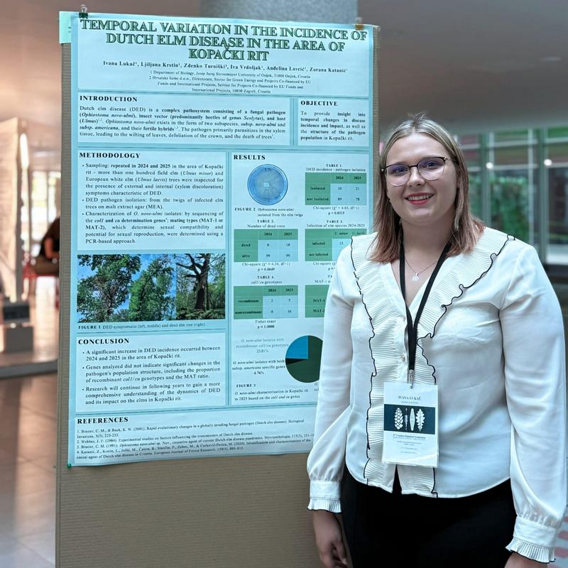 U razdoblju 01.06.2025. – 31.12.2025., uspješno je realiziran studentski projekt pod nazivom „Sezonska dinamika širenja holandske bolesti brijesta na području Kopačkog rita“. Voditeljica studentskog projekta bila je Ivana Lukač, studentica 2. godine sveučilišnog diplomskog studija Biologija; smjer: znanstveni, pod mentorstvom izv. prof. dr. sc. Zorane Katanić i izv. prof. dr. sc. Ljiljane Krstin. Projekt je financiran sredstvima Studentskog zbora Sveučilišta Josipa Jurja Strossmayera, a dobiveni rezultati predstavljeni su na 8. Hrvatskom botaničkom simpoziju s međunarodnim sudjelovanjem. Iz provedenog istraživanja proizašle su nove znanstvene spoznaje o fitopatogenoj gljivi O. novo-ulmi i sezonskoj dinamici njezina širenja te se rezultati mogu koristiti za procjenu dugoročnog utjecaja koju bi ovaj patogen mogao imati na zaštićenom području Kopačkog rita.
